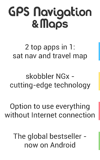 GPS Navigation & Maps includes skobbler's innovative NGx map technology. So you get maps that look great and move, zoom and turn with unrivalled fluidity. Simply touch the map for slightly longer to interact with individual points on the map. You will never get a blurred image or useless empty 'map-loading' tiles.